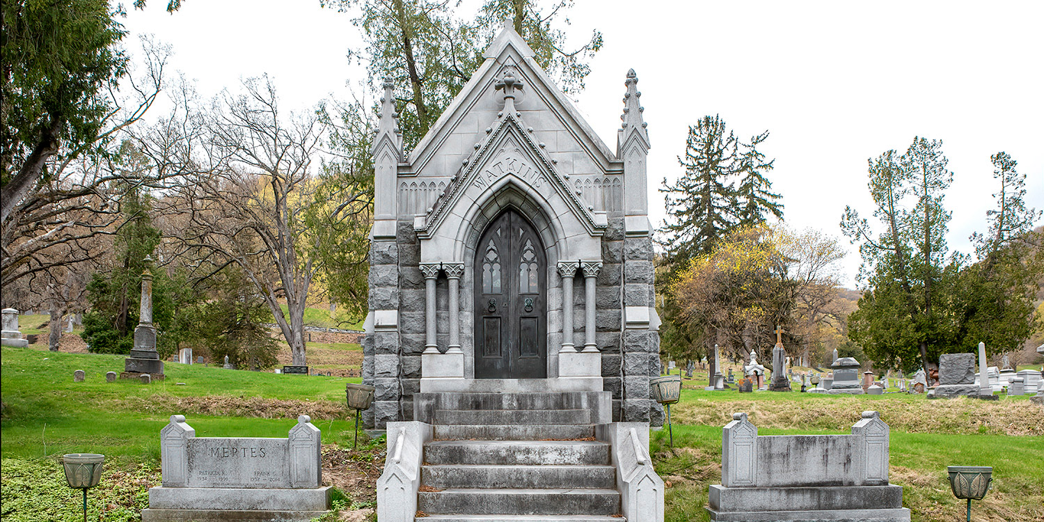 The total weight of stone shipments came to 128,000 pounds or 64.4 tons. The mausoleum is different from any other in the cemetery with the provisions being made for the interments of bodies under the floor of the vault instead of along the sides. The mausoleum looks like a little chapel, with handsome stained-glass windows on the south end of the structure.